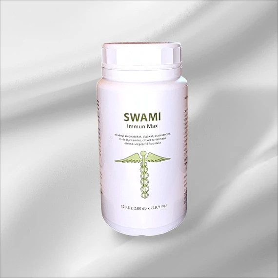 Swami Immun Max növényi kivonatokat, algákat, astaxanthint, C és D-vitamint, cinket tartalmazó étrend-kiegészitőkapszula.