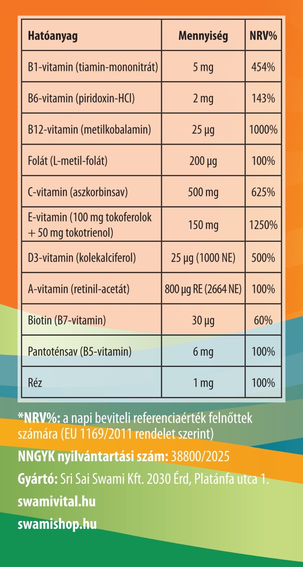 🟢B-vitamin komplex: B1 (5 mg), B6 (2 mg), B12 (25 µg),Biotin (30 µg), Pantoténsav (6 mg)